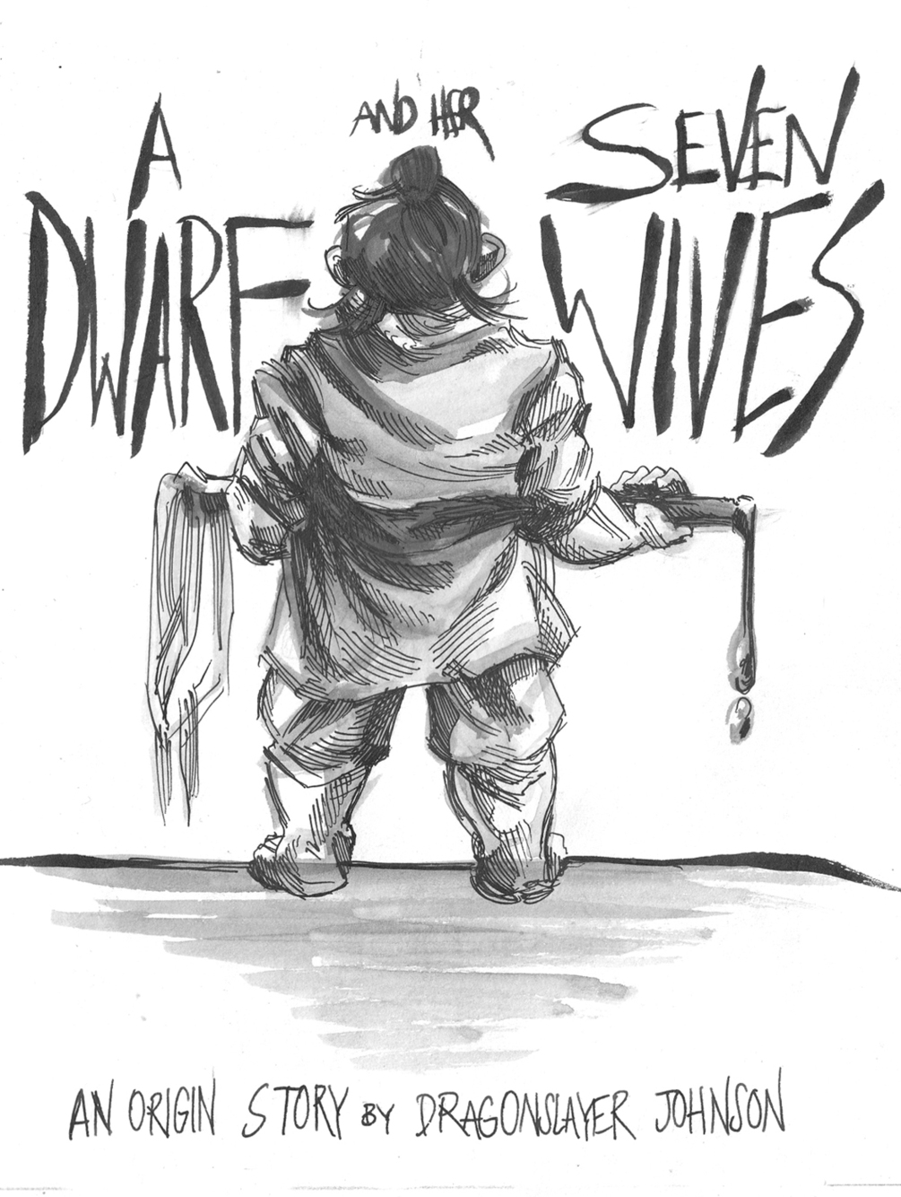 This zine tells the 170+ year story of Vampire Bandit Queen Gnoorkwung, a character I have been playing in a friend's richly developed RPG system for multiple years myself. A fairy tale of sorts, 'A Dwarf and Her Seven Wives' are a family comprised of many of the forms that love can take. From the bond between warriors to the bond between a warrior and her weapon, there is no limit to the power that a strong love can grant to its wielder.