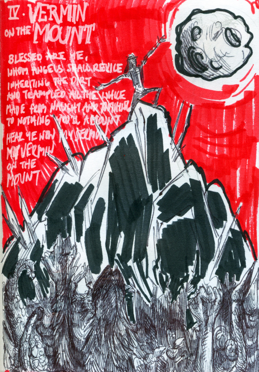 THE BLACK TESTAMENT is the first published EP by solo black metal artist +AnarChrist+ (Dennis Finnegan). In this intimate acoustic record, the one-man-band explores topics of faith (and the lack thereof), family (and the lack thereof), and the pain of deepest betrayal. This zine contains choice lyrics from the 6 songs on the record, accompanied by illustrations which detail the torment in the artist's soul.